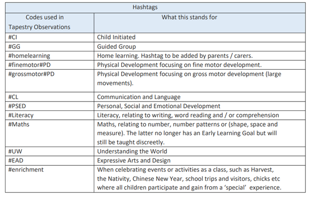 The Reception staff keep ongoing learning journeys of each child through Tapestry which are available for parents and carers to view online. As an Early Years Team across our Trust, we now categorise observations using hashtags, e.g. #GG or #CI to show whether an activity was guided or child initiated. We also use a hashtag for each area of learning, e.g. #maths, #literacy, #UW on so on. We also encourage parents and carers to add Tapestry observations of their child, as we understand what a significant part parents and carers play in their child’s early learning and development. When completing an observation, we ask that parents and carers include #homelearning within their observation. Clicking on a specific hashtag allows staff to view the progression of a child’s skills in a specific area of learning, over time.