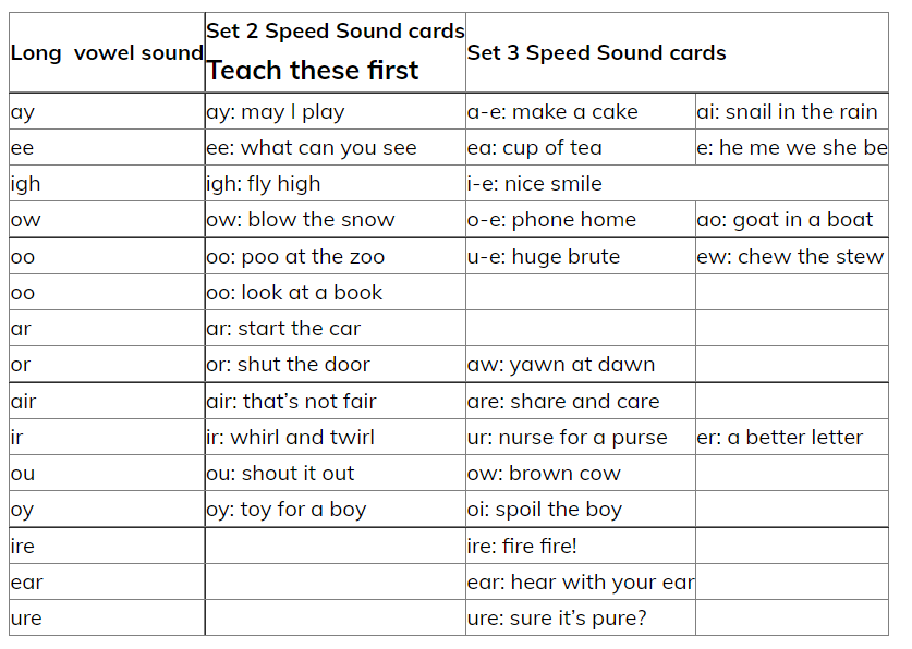 The children are then taught Set 2 Sounds - the long vowels. When they are very confident with all of set 1 and 2 they are taught Set 3 Sounds.