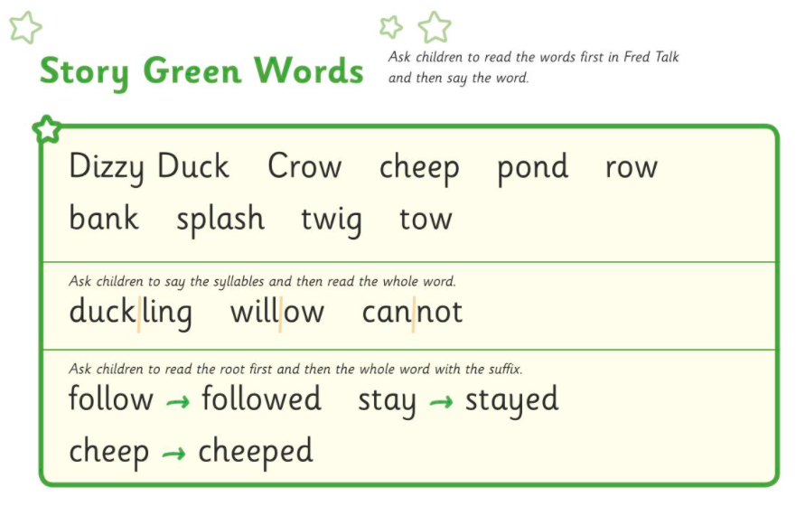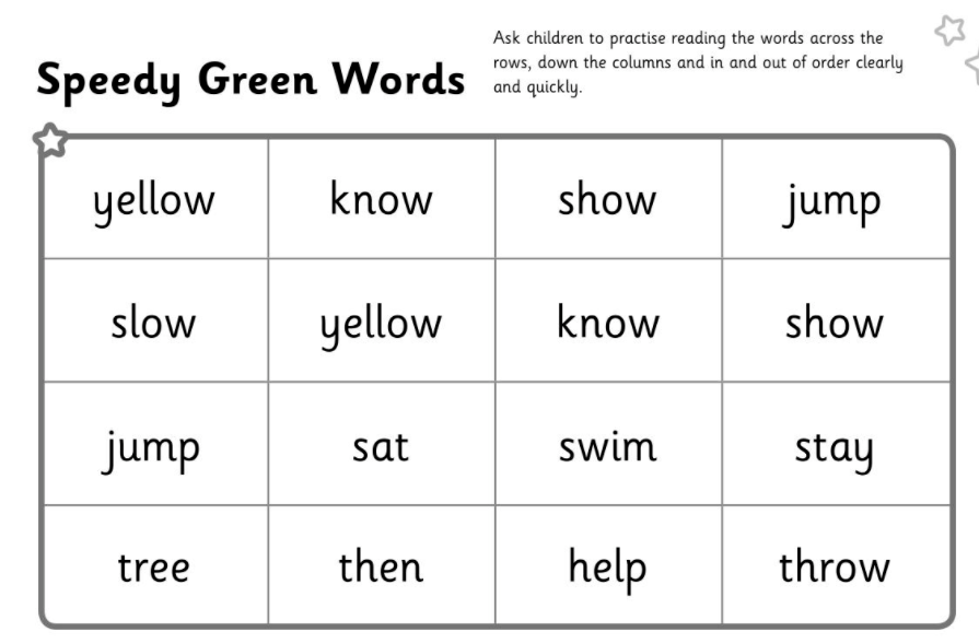 Within all the RWI Speed Sound sessions and Core Storybook sessions, children will be exposed to red and green words to learn, to help them to become speedy readers. Red words are words that are not easily decodable. Story green words are the main words within a specific text and are linked to the sounds that they have been learning. They aim to extend children’s vocabulary. On day one of introducing a new Core Story book, we make sure that children can read each of these Story Green words and ensure that they know what each of these words mean. Speedy Green words are also specific to a particular text, and these words are read using Fred in your Head. The aim is for children to read these words with fluency, at 1 word per second.