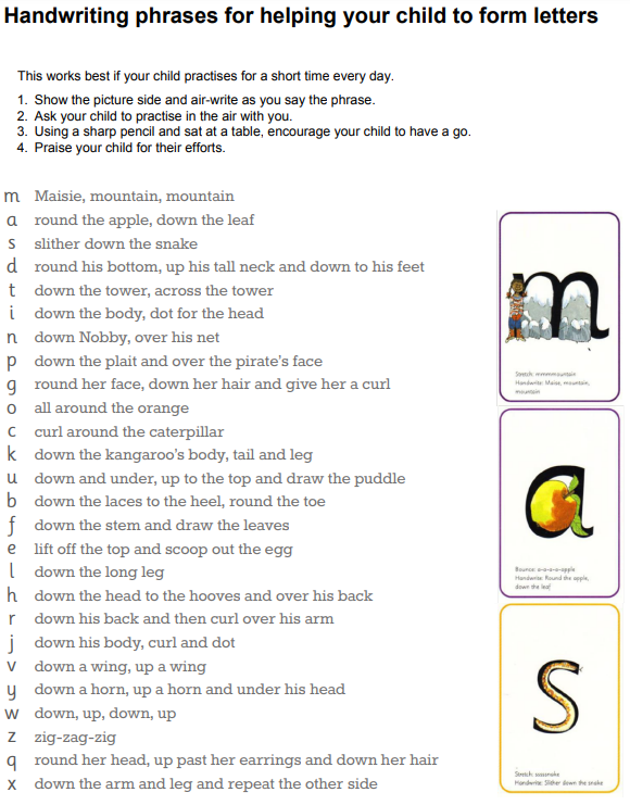 Before you start to teach your child the sounds, we focus on naming the pictures for each single sound. For example, mountain, apple and snake. We then introduce the sound. For example, ‘m’, ‘a’ and ‘s’. These are the sounds we use to speak in English. Children initially begin using pictures and letter formation phrases for each sound; this will help children recognise the sound and then form the shape of the sound. For example, ‘m’, ‘mmmmountain’, ‘Maisie Mountain Mountain’.
